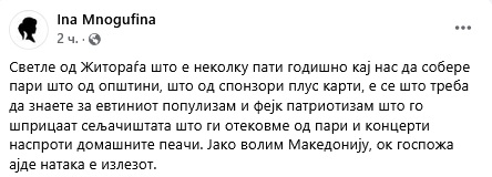 И популарната Ина Многуфина остро реагираше на страшшната провокација која ја направи вдовицата на Аркан Ражнатовиќ на вчерашниот настап во Велес. Во продолжение, статусот на Ина :