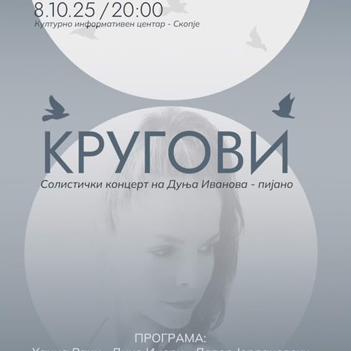 На 8 октомври (среда) во Културно-информативниот центар со почеток во 20 часот, пијанистката Дуња Иванова ќе одржи концерт со наслов „Кругови“. Централен дел од програмата на концертот се четирите пиеси со истоимен наслов, чиј автор е пијанистот и композиторот Дино Имери. Иванова премиерно ќе ги изведе неговите: „Ни ваму ни таму“, „Валцерот на Миро“, „Мајка“ и „Дрво“.