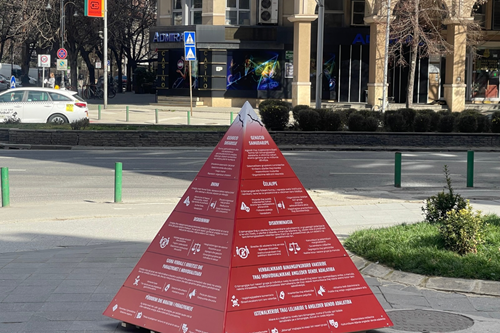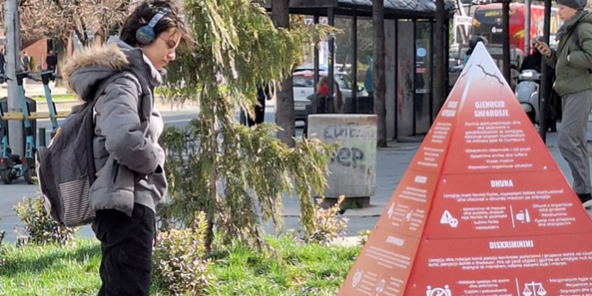 „Пирамидата на говорот на омраза“ поставена на скверот кај Ким на булеварот Партизански одреди е визуелна и едукативна структура која го прикажува постепеното ескалирање на омразата во едно општество, од навидум „невини“ предрасуди до најекстремните форми на насилство и истребување.